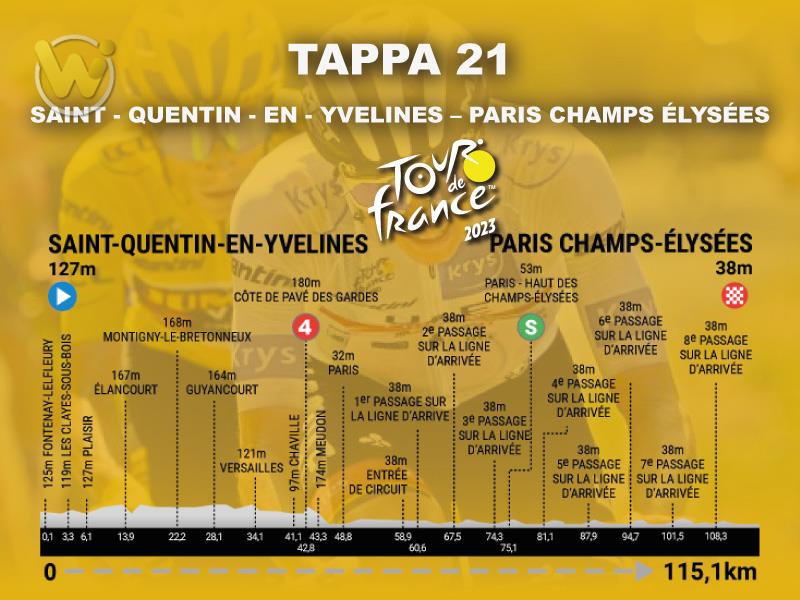 Il Tour de France 2023 è arrivato all'appuntamento finale: oggi, domenica 23 luglio, si corre la 21esima e ultima tappa, la Saint-Quentin-en-Yvelines – Parigi. Il tracciato, lungo 115,1 chilometri, prevede la classica passerella finale e lo spettacolare arrivo sugli Champs Élysées parigini. In maglia gialla, ormai certo della vittoria in classifica generale, c’è Jonas Vingegaard. Il tracciato attraversa la regione dell'Ile-de-France. Si parte da Saint-Quentin-en-Yvelines e si arriva a Parigi, sugli Champs Élysées. Prima dell’ingresso in città c’è l'ultimo Gpm di questa edizione: la Côte du Pavé des Gardes, salita di quarta categoria lunga 1,3 chilometri al 6,5% di pendenza media. Poi si entra sul classico circuito cittadino dei Campi Elisi, che inizia al chilometro 58,9: si tratta di 6,9 chilometri da percorrere otto volte, fino alla volata conclusiva verso il traguardo.